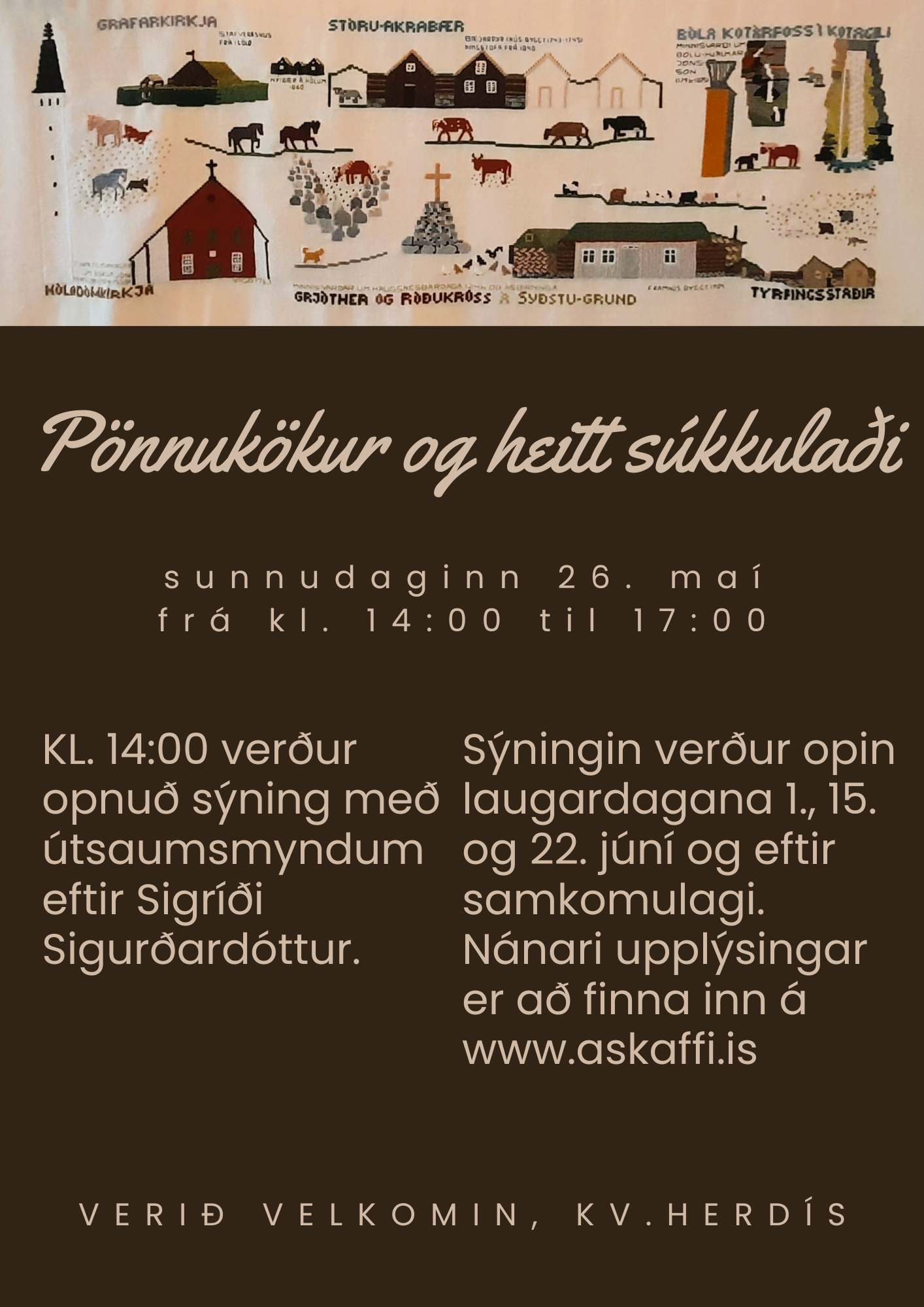 Á þessari sýningu eru glæsilegar útsaumsmyndir og reflar sem flest eru saumuð með íslenska krosssaumnum. Það eru ekki margir sem búa til listaverk með því að sauma út með nál og ullarþræði eins og Sirrí gerir. Myndirnar eru í einkaeigu og margar þeirra segja sögur eigandans. Á sýningunni getum við fengið að njóta og haft gaman af.